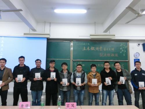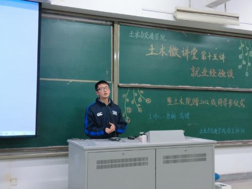 2015年11月10日19:00,伟德国际1946“土木微讲堂”第十五讲之“就业经验谈”暨学院赠2012级同学专业书籍仪式在本部闻天馆303成功举办。本次微讲堂邀请了已参加工作的2010级土木工程专业本科毕业生高健和唐楠学长作为主讲人,为学院2013级和2014级的同学们分享了自己的就业经验。
