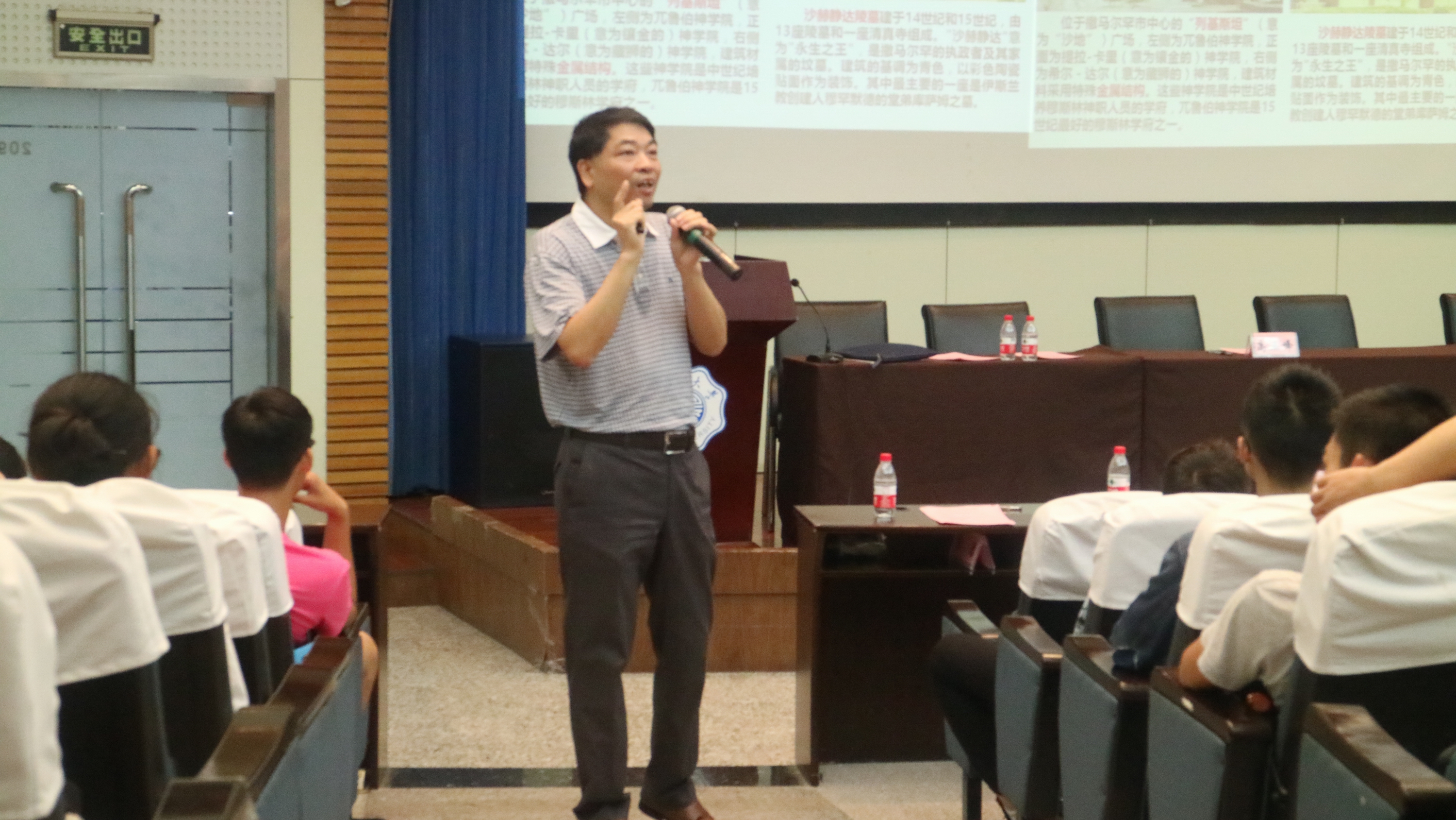 第一部分结束之后,院长高玉峰教授为17级新生们带来了入学第一课。围绕“一带一路”这一热点话题,高玉峰教授生动灵活地阐述了什么是“一带一路”,而后追古溯今,将古代的文明遗产“丝绸之路”与当今的发展战略相联系。接着高院长引用中山桥等著名建筑物的实例,阐明了“一带一路”与土木工程、交通工程的密切联系,并指出“一带一路”带来的新的发展机遇,将话题逐渐缩小至“一带一路”对每个个体产生的影响。最后,高院长通过形象的事例将专业知识与实际生活相结合,勉励大家要学以致用,提升专业素养。