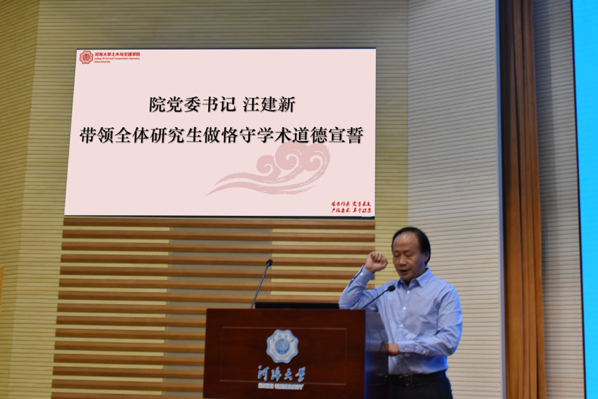 大会的第一项议程为迎新大会,院党委汪建新书记带领全体新生进行了恪守学术道德宣誓仪式。随后,院长高玉峰教授致辞并对学院做了详细介绍。接着,高院长从研究生与本科生的区别、毕业标准和研究生的目标三个方面介绍了研究生的定位与特点,并寄语全体新生以科研为主,兼顾学习、生活和健康,追求更高的学术理想。最后,高年级学生代表2017级桥梁工程专业博士研究生王秋东同学分享了学习生活经验与感悟,并向2020级新生表达了美好祝愿。新生代表2020级结构工程专业博士研究生问储园同学提议新生应该有迎难而上、善始善终的态度,要珍惜时间,不负韶华。