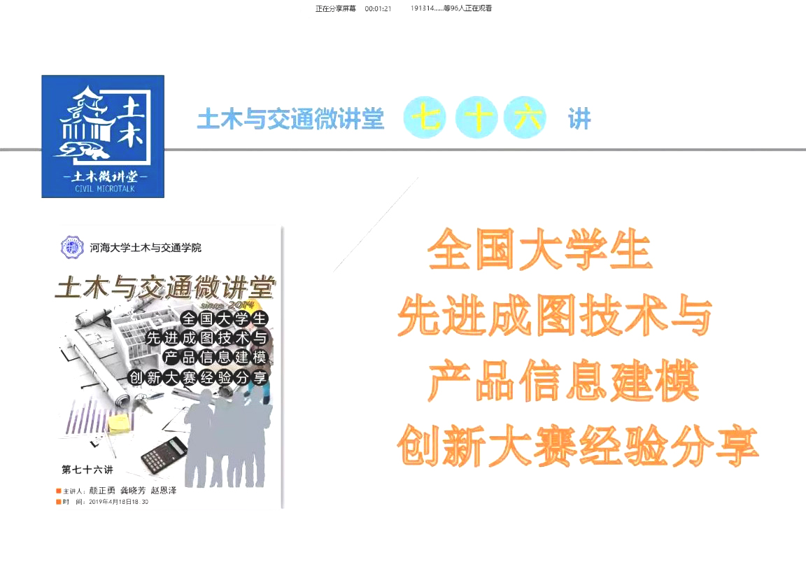 2020年4月18日晚6:30,由伟德国际1946主办,学院本科生科协承办的土木与交通微讲堂第七十六讲之“全国大学生先进成图与产品信息建模创新大赛”经验分享成功举办。由于疫情原因,本次微讲堂仍采用云直播方式进行本次微讲堂很荣幸地邀请到了2016级本科生颜正勇,2017级本科生龚晓芳和2018级本科生赵恩泽三位同学为大家进行经验分享。伟德国际194617、18和19级部分学生聆听了本次讲座。