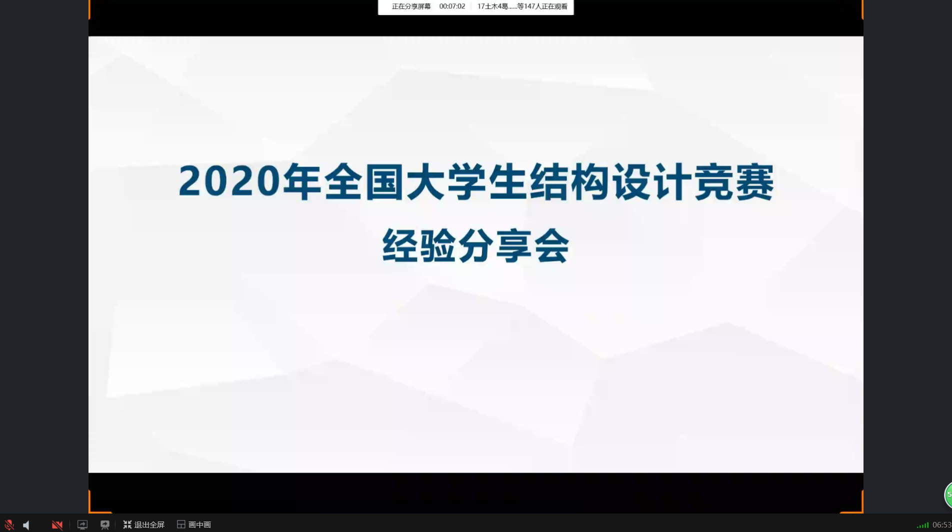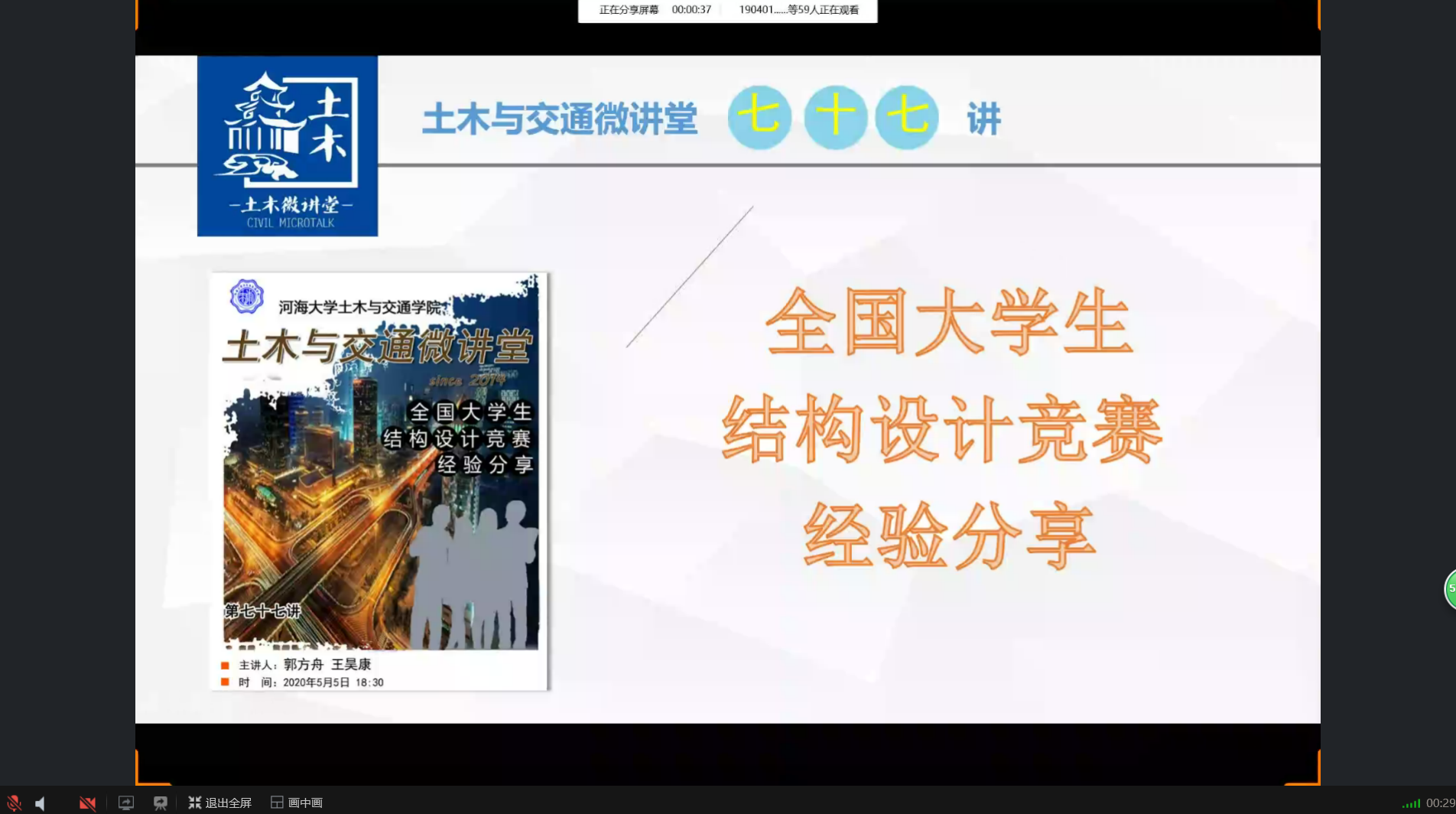 2020年5月5日18:30,由伟德国际1946主办,学院本科生科协承办的土木与交通微讲堂第七十七讲之“全国大学生结构设计竞赛经验分享会”以线上直播的方式成功举办。本次微讲堂邀请到了2017级土木工程结构方向本科生郭方舟和王昊康同学为大家带来经验分享。伟德国际194617、18和19级部分学生聆听了本次讲座。