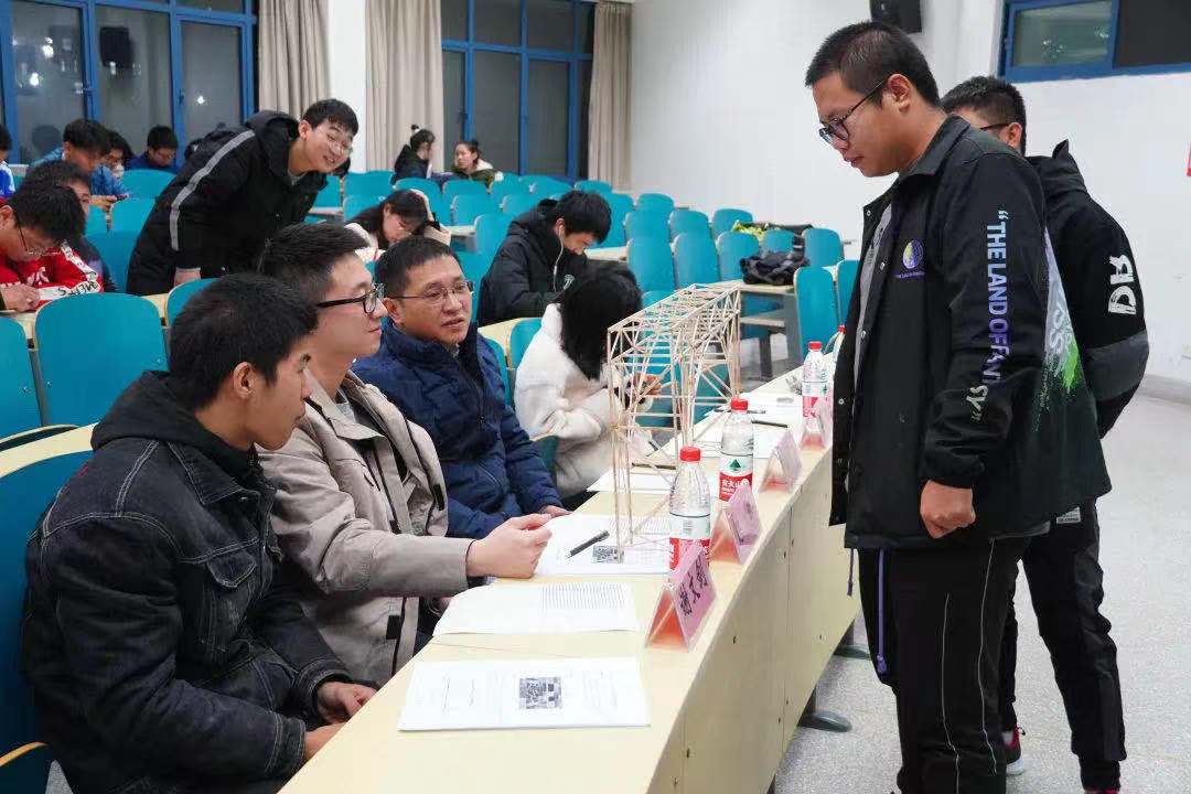 比赛开始前,各小组依次签到、称重,于观众席候场准备。参赛队伍签到完毕后,比赛正式开始。主持人先对赛题和比赛流程进行了简单的介绍。紧接着,各小组按照签到顺序依次进行比赛。本次比赛分为评委点评、模型加载和评委打分三部分。首先,各小组依次将模型交给评委点评,评委们从专业角度分析了结构的合理性,指出了模型的优点、不足和可能的优化方案,使参赛选手们了解到更多模型制作的原理和技巧。