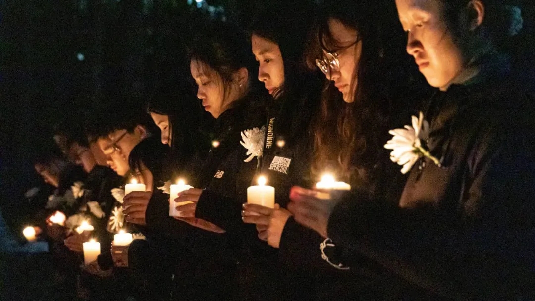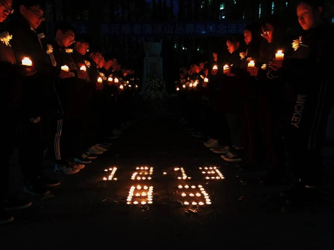 五点二十分,同学们共同在纪念碑前用蜡烛摆上“12·13”和“83”的字样,并手捧蜡烛和鲜花,围绕“12·13”、“83”的字样站立,低头默哀,用蜡烛寄托对大屠杀死难同胞的哀思、表达对不甘屈辱奋起反抗的斗士的敬重。