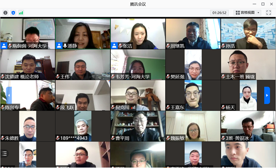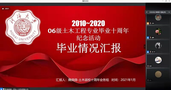 2020年1月2号,06级土木工程专业校友和学院师生们开展了毕业十周年纪念活动。目前,多地疫情散发,也丝毫不能阻挡校友们相聚的热情,为响应学校疫情防控的要求,原精细筹备在河海校园内举行的06级土木专业毕业十周年纪念活动以另一种特殊的方式举行——线上云聚会。此次会议由院党委潘静副书记主持,学院院长高玉峰教授、副院长周继凯教授、副院长刘云副教授、曹平周老师(06级分管教学副院长),杨天老师(06级辅导员)、韦芳芳老师(班导师),聂丽英老师(班导师),孙少锐老师(班导师),陈礼和老师(班导师),王伟老师(班导师),周云东老师(土力学),沈德建老师(土木工程导论),郑苏娟老师(高数),吴跃东老师(地基处理),卢漫老师(素描),蒋勇老师,汤茂买老师,张洁老师以及06级校友代表和17级学生志愿者共同参与了本次会议。