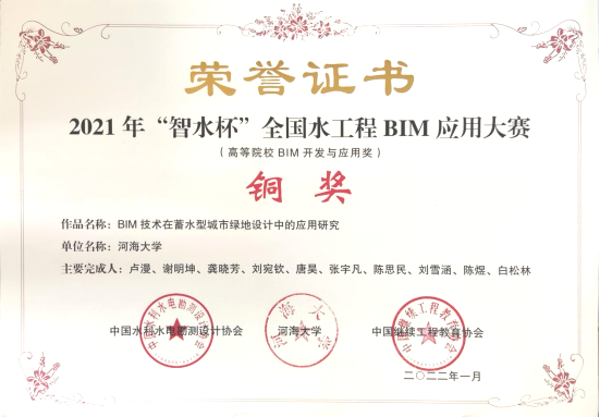 由中国水利水电勘测设计协会、伟德国际victor1946、中国继续工程教育协会联合举办的2021年“智水杯”全国水工程BIM应用大赛,经系列评选与公示,已完成评审。我院建筑与景观研究团队,以作品“BIM技术在蓄水型城市绿地设计中的应用研究”摘得院校组铜奖。