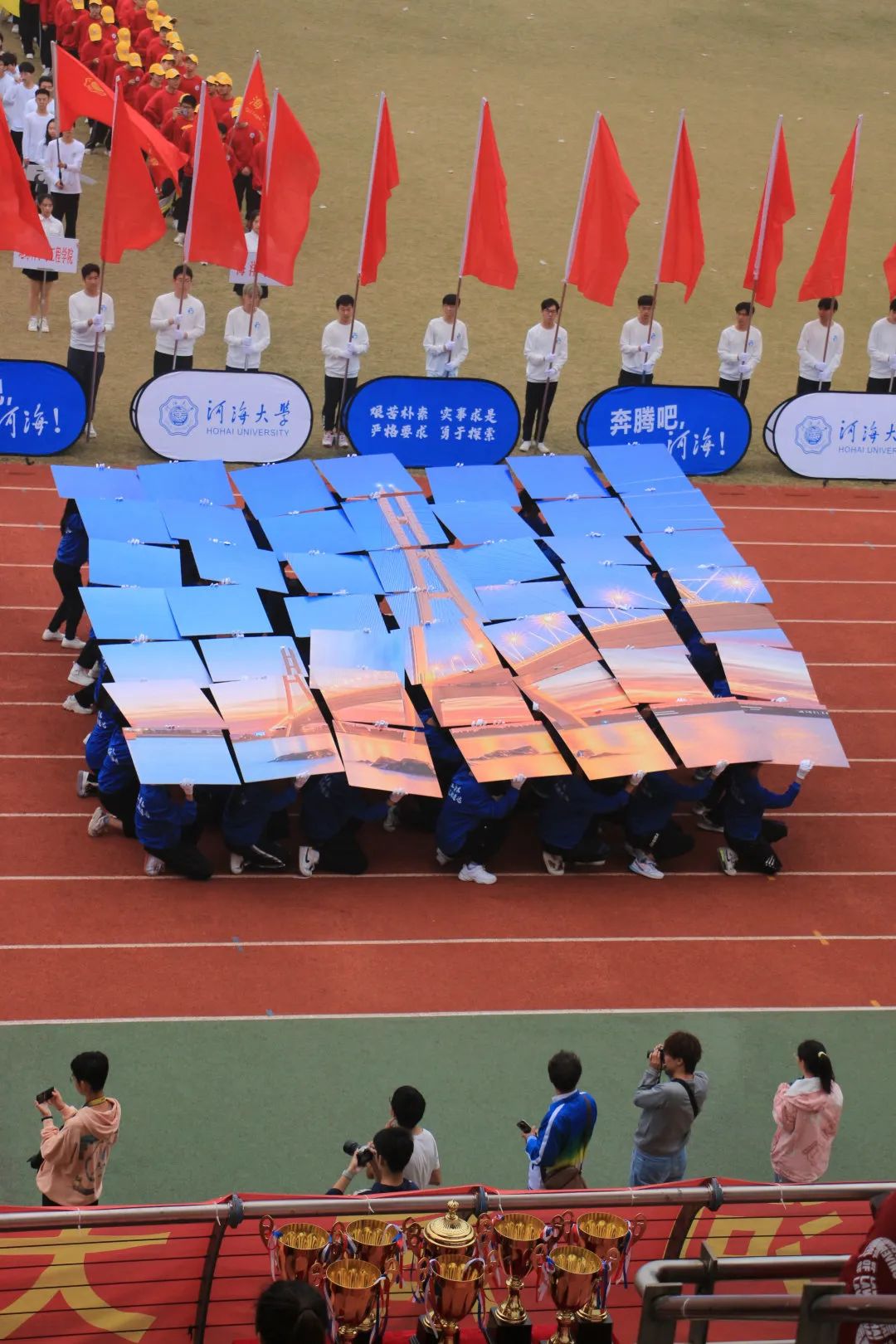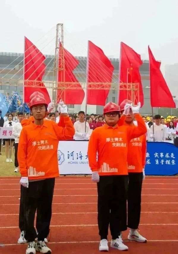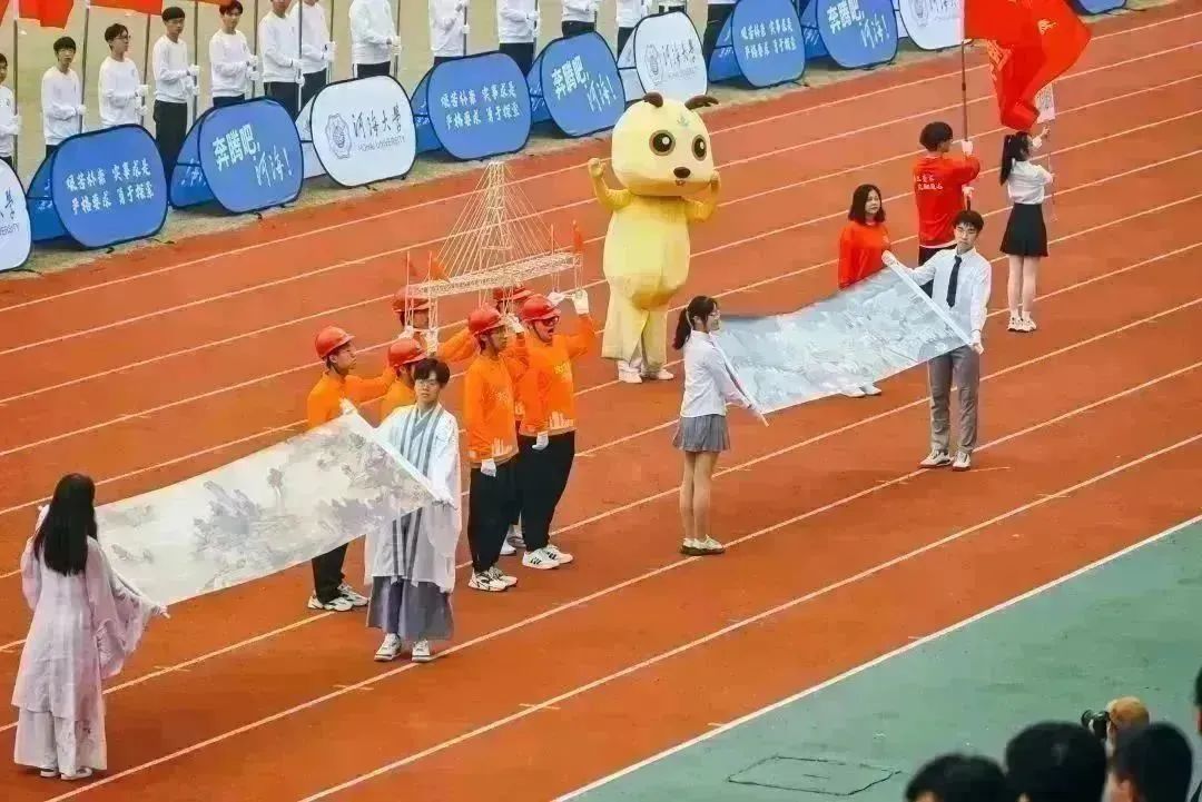“一桥飞架南北,天堑变通途”,从南京长江大桥的突破到南京五桥的开创,在方阵展示环节土木院的同学们通过手中翻转的图案向观众展示着新中国以来,我国在基础建设领域的突飞猛进。从古代的飞檐廊亭到当下的高楼栉比,方阵中央的桥梁模型不仅仅象征着连向彼岸助力交通便捷的路,更是全国人民迈向全面实现社会主义现代化的道路,是中华民族实现伟大复兴中国梦的奋斗之路。最终凭借着巧妙的构思和出色的表演,土木院获得了本届校运会开幕式的最佳入场方阵。