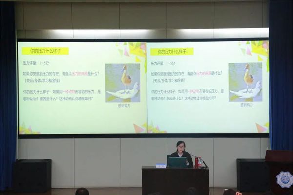 紧接着,闫老师让同学们回顾自己进入大学以来的生活状态,通过将压力与动物相关联的方式,引导同学们敞开心扉,共同寻找压力的来源。在此环节中,与三位同学进行了互动,他们各自倾诉了自己在学习和生活中所面临的压力。随后,闫老师悉心为同学们分析问题,提出建议,帮助同学们化解了心结。
