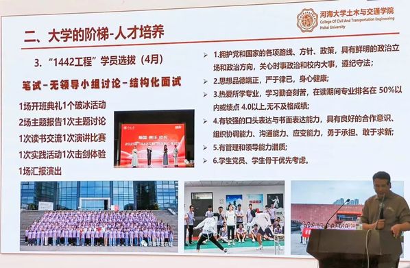 随后,高老师以“乘风破浪,勇往直前”为题,从“学业成绩”、“人才培养”、“组织管理”、“生活服务”、“近期工作”五个部分展开,总结了上学期学业情况,阐明了学习成绩的重要性,介绍了评奖评优、入党、毕业的流程及要求,强调了宿舍管理、学校规章制度等组织管理规范,提醒同学们谨防诈骗,保持身心健康,做好学期规划。高老师在最后提出了“守时、认真、主动、积极”的要求,同时表达了对同学们精彩表现的期待。