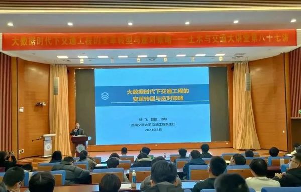 首先,杨飞教授从我国推进数字化转型的相关政策出发,引出了交通工程行业正在面临的重大变革:由传统的“四阶段交通模型”转变为“利用大数据技术改进与优化的交通模型”。他以成都双流国际机场与天府国际机场之间的接驳问题为例,说明了交通大数据在城市交通规划方面的重要性。另外,杨飞教授还着重介绍了交通行业变革背景下人才培养模式的转变,他建议同学们利用在校时间提前积累信息技术行业的相关知识,并将所学知识融会贯通,实现交通、信息学科的交叉。