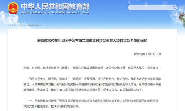 教育部高校学生司关于公布第二期供需对接就业育人项目立项名单的通知(教学司函〔2023〕6号)http://www.moe.gov.cn/s78/A15/tongzhi/202304/t20230413_1055522.html