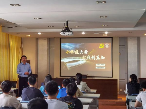接着,高建相老师进行了《小桥筑大爱,实践创真知》的主题党课分享。高老师从“铺信仰之桥”出发,介绍了茅以升先生以桥梁实业报国的赤诚爱国情,分享了新时代十年港珠澳大桥、北京大兴国际机场等大国工程,让大家感受到中国迈向强国路上的坚实脚步。