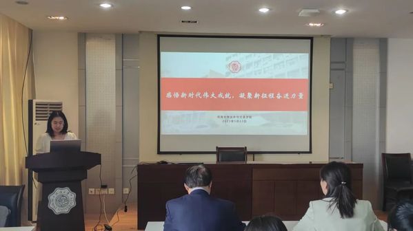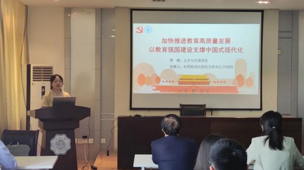 接下来,砼研新语社团党支部书记问储园同学分享了《以教育强国建设支撑中国式现代化》主题党课。她从“教育强国”的“强”字引入,分享了新时代加快建设教育强国的重大战略意义、扎实推进加快教育高质量发展的重点任务和教育强国建设支撑中国式现代化三方面的内容。