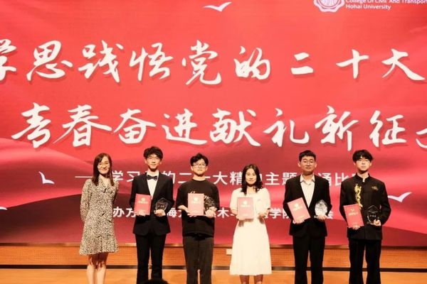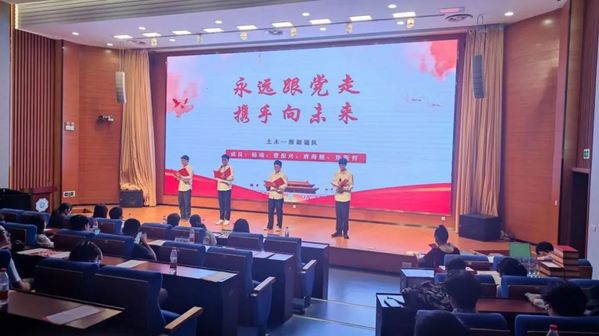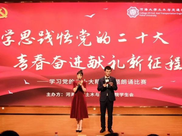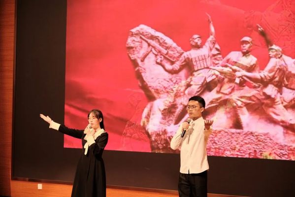 大赛第一篇章——“传承红色经典,勇担历史使命”就此拉开序幕。砼研新语社团党支部的吕晨希、陈卓然、屠建敏等同学通过精彩的舞台表演呈现了作品《强国志高远,青春正当时》;土木院2020级本科生席皓、李顺等同学带来了作品《红船》;2021级研究生吴琼、袁有明同学激情澎湃地朗诵了《不朽》;2021级本科生谷冬泉、杨雨生等同学朗诵了《传红色基因,续时代篇章》。