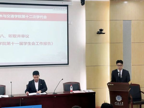 伟德国际1946学生会主席团成员席皓代表第十一届学生会作工作报告。报告从“强化思政引领,凝聚青年力量”、“持续推进改革,完善组织建设”、“坚持守正创新,打造土木品牌”、“牢记服务宗旨,传递土木之声”四个方面回顾了第十一次学生代表大会以来学院学生会工作取得的进展和成果,并提出对未来工作的设想和建议,聚焦保持和增强政治性、先进性、群众性,力争做好“强化校区共治,凸显土木关怀”“提高志愿覆盖,激发土木活力”“完善科创体系,赓续土木品牌”三个方面的工作,构建学生会工作新格局。