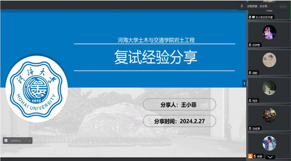 接着,王小菲同学结合自身经历,为同学们详细解说了伟德国际victor1946岩土工程的复试流程。复试包括土力学科目的笔试以及面试,面试包括英文能力测试、中英文自我介绍和专业课问答题。当老师提问到自己不熟悉的内容时,同学们也要保持冷静,微笑应对,给老师们留下大方得体的印象。她鼓励同学们无论初试分数高或低,都不要轻易松懈或过度焦虑,坚持把复试准备充分才是最重要的。