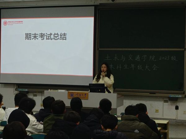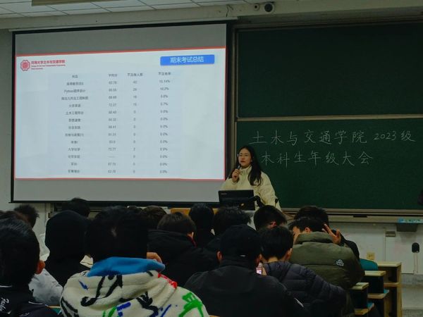会上,胡锦蓉老师进行了第一学期学期的期末总结,为同学们展示了我院上学期的期末成绩,分析各科目均分、挂科率等,并寻找出现的问题,总结经验和改进方法。此外,胡老师还为同学们讲解了学分、绩点、保研推优等相关信息,解答了同学们相关方面的疑惑。