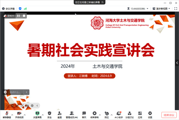 活动伊始,主持人冮轶博同学为大家详细介绍了本次社会实践的项目申报类别、主要形式和具体实践流程。他强调了暑假社会实践在培养学生实践能力、拓展视野、增强社会责任感等方面的重要意义,提醒同学们要详细策划、周密组织、踊跃开展,利用暑假时间走进社会大课堂,充分提高自身能力。