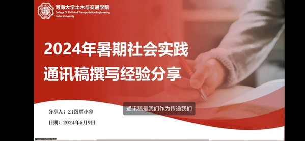 接着,院团委文宣部2021级覃小容同学向大家分享了关于通讯稿撰写的经验,重点强调了标题撰写、正文用词要求和照片拍摄注意事项等的问题。她提出,撰写一篇高质量社会实践活动通讯稿,既要有良好的表达能力,也要具备一定的专业素养。