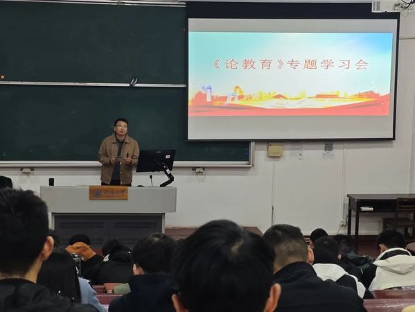 活动伊始,高建相老师以饱满的热情和独到的见解,引领大家走进了《论教育》的广阔世界。高老师聚焦中共教育部党组关于做好习近平同志《论教育》学习宣传工作的通知,提出要深刻认识做好习近平同志《论教育》学习宣传工作的重大意义,从认真做好原文研读、深入开展研究阐释、广泛开展宣讲巡讲、切实加强组织领导等方面切实做好习近平同志《论教育》学习宣传工作。高老师给大家介绍了《论教育》中的主要篇目。例如,从《在全国教育大会上的讲话》中,大家深刻认识到教育是民族振兴、社会进步的重要基石,是功在当代、利在千秋的德政工程,也深刻感受到了教育对于国家富强、民族振兴、社会进步、人民幸福的极端重要性。每一篇文稿都充满了对教育的深情呼唤和殷切期望,让在场的同学深受触动。