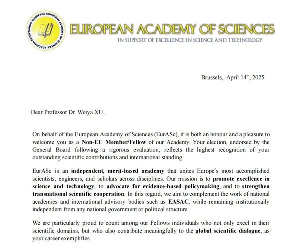 近日,我校徐卫亚教授收到欧洲科学院致信,祝贺他被增选为欧洲科学院外籍(非欧盟)院士(Non-EU Fellow of the European Academy of Sciences)。