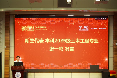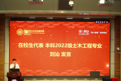 随后,2022级土木工程专业刘汕同学作为在校生代表发言,他结合自身经历给新生们提了三点建议:一是以终为始,笃行致远;二是以行求知,以知促行;三是以不息为体,以日新为道。他祝愿新生们在大学四年里遇见志同道合的伙伴,也遇见更好的自己,用青春书写钢筋与混凝土的诗篇。