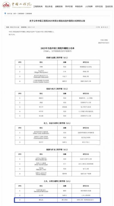 今日,中国工程院公布2025年院士增选当选外籍院士名单