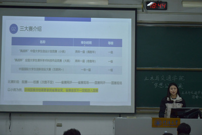 在创新创业分享环节中,秦子晗学姐聚焦土木与交通领域竞赛展开详解。她系统介绍了大学生交通科技大赛、“挑战杯”等国赛、省赛的主流赛事类型及其内容,并结合自身备赛经历,分享经验,鼓励学弟学妹们主动参与竞赛,以赛促学,以赛促创,在竞技中提升专业应用能力与创新思维。